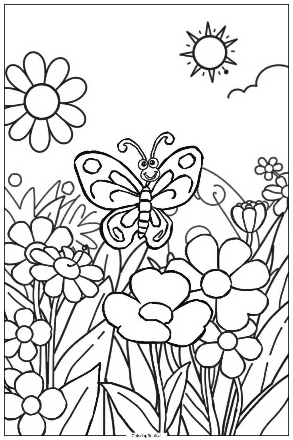 Butterfly Garden Flowers Coloring Page Free PDF PNG Printable