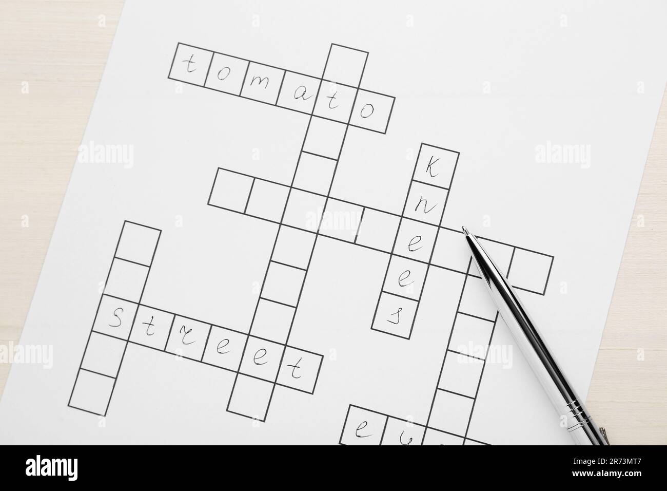 Crossword With Answers And Pen On White Wooden Table Top View Stock Photo Alamy