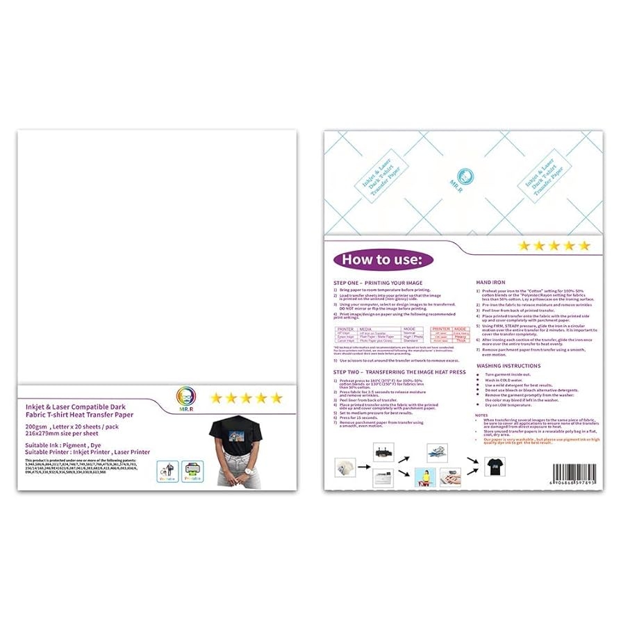 Amazon MR R 8 5 x11 Inkjet And Laser Compatible Printable Heat Transfer Vinyl Paper For Dark T shirt Fabric Made In USA 20 Sheets Office Products