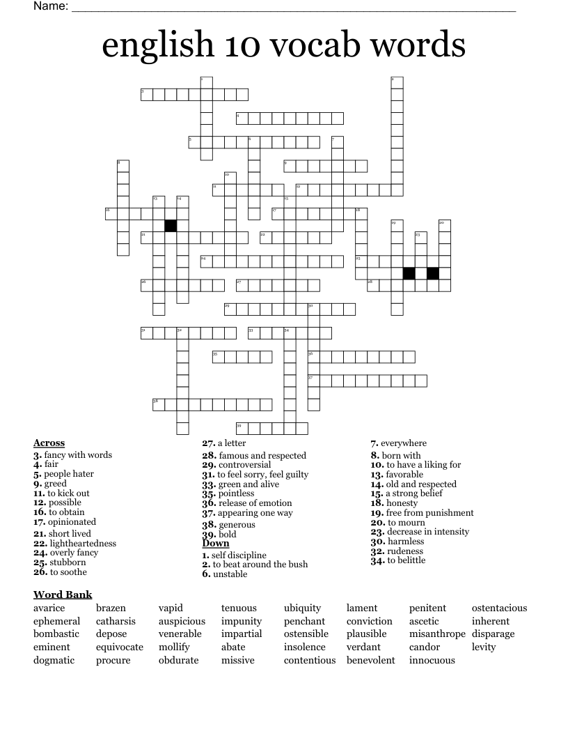 English 10 Vocab Words Crossword WordMint